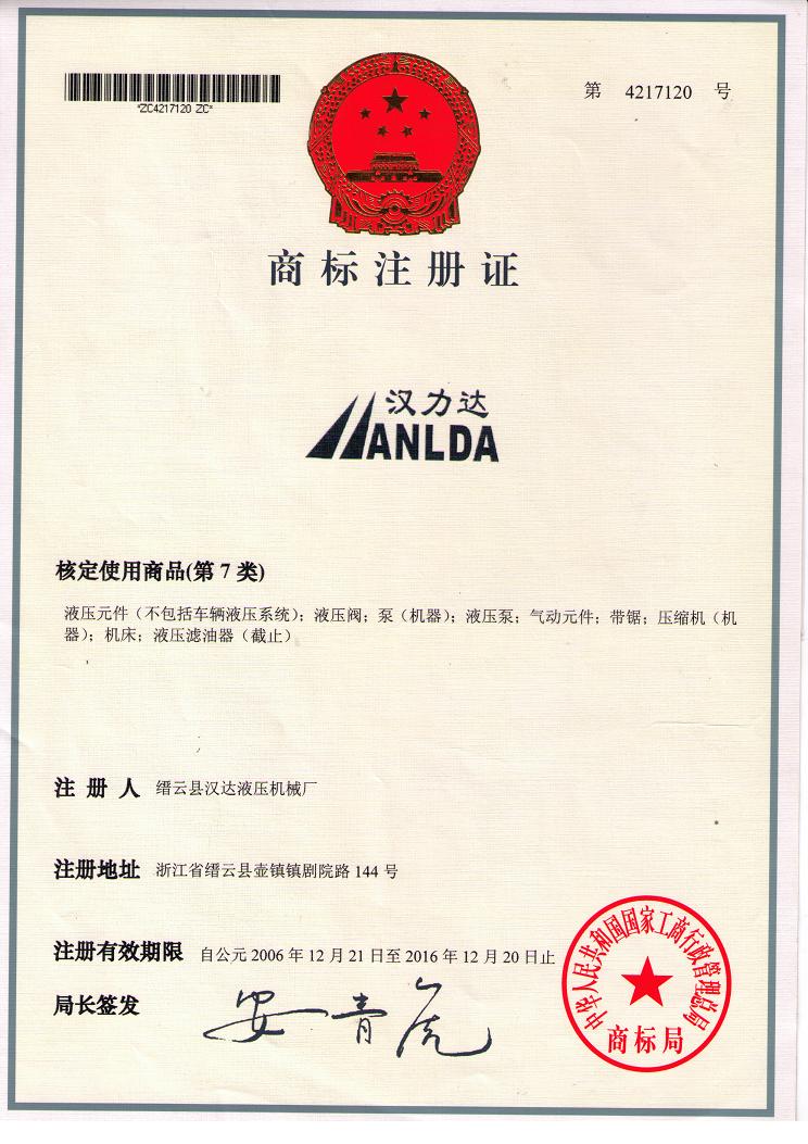 漢力達(dá)商標(biāo)注冊(cè)證書
